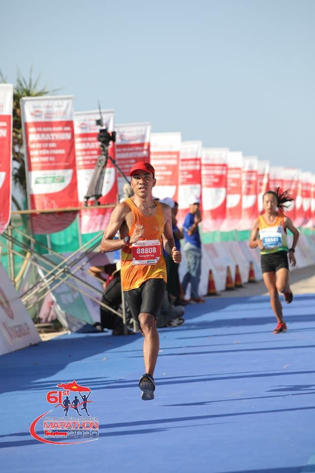 “Lúc chạy cùng Thanh, hai bên là hai hàng cờ bay phần phật trong gió, tôi cảm thấy thực sự rất… phê. Tôi cố thì cũng theo được khoảng 2km nữa nhưng sợ gục (cười) trên đường chạy không về đích nổi. Hơn nữa, tôi lúc ấy cũng đang trong nhóm cạnh tranh tốp đầu của hệ phong trào nên không thể lạc quan quá được”, anh kể. Nhiều người còn không biết trước đó vài hôm, anh Hoàng Huy cùng nhóm bạn của mình đã bơi từ ngoài biển vào đảo Lý Sơn với quãng đường dài hơn 20km.