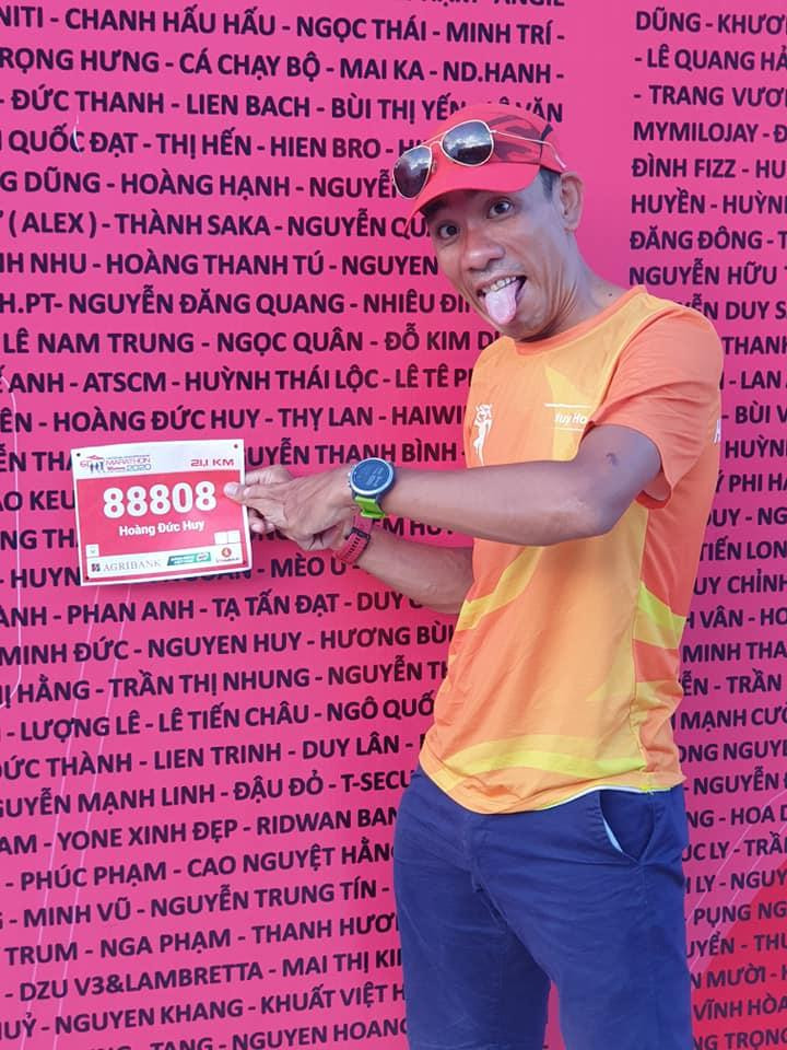 “Lúc ấy, tôi hoàn toàn chạy theo cảm hứng. Tôi thấy xe dẫn đường thì đoán là tốp đầu của cự ly marathon. Tự nhiên máu lên thử chạy theo”, anh Huy nhớ lại. “Lúc đầu, tôi cũng đã theo nhóm dẫn đầu cự ly 21km gồm nhiều chân chạy rất mạnh trên quãng đường 6km rồi. Xem lại thống kê đồng hồ, tôi đã chạy pace (tốc độ) dưới 3 phút/km ở vài trăm mét đầu tiên (tương đương tốc độ 20km/h - PV). Sau đó, tôi phải giảm tốc độ vì khó có thể theo được lâu nếu cứ duy trì như vậy. Hài hước nhất là khi mấy trọng tài cứ đi xe máy bên cạnh hỏi nhau xem tôi là ai mà đu theo đội tuyển 21km”.