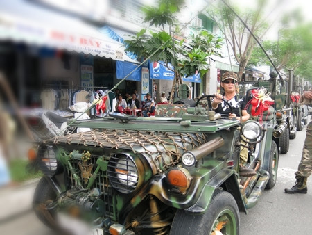 Một đoàn xe rước dâu với toàn xe Jeep dã chiến trên đường Nguyễn Hữu Thọ, Đà Nẵng sáng 12/12 đã gây ấn tượng mạnh với người đi đường.