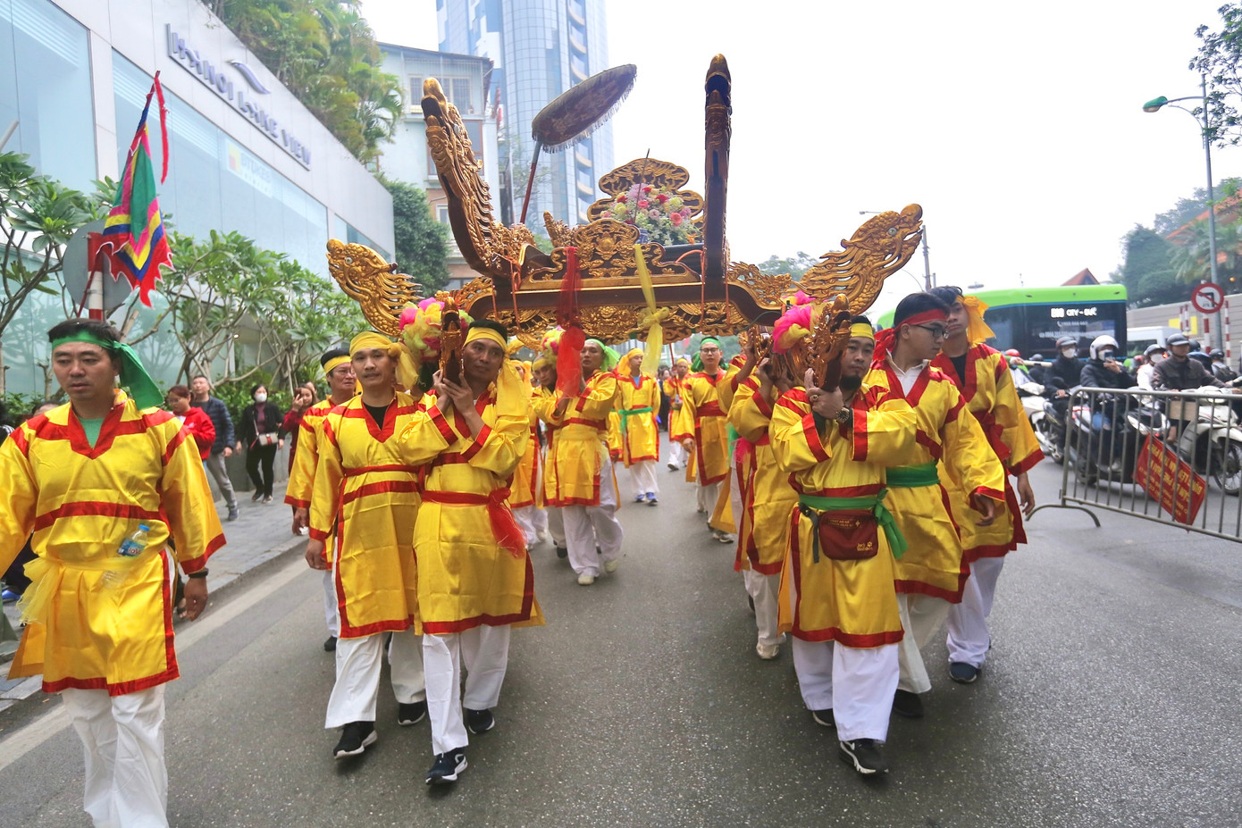 | Đoàn rước kiệu vượt dốc phố Yên Phụ qua đường Thanh Niên tới chùa Trấn Quốc. |