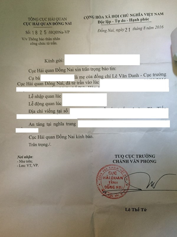 Theo đó, ngày 21/8/2016, thừa ủy quyền Cục trưởng, Chánh văn phòng Cục Hải quan Đồng Nai Lê Thế Từ đã ký văn bản số 1825 về việc thông báo thân nhân công chức từ trần, gửi nhiều đơn vị trong tỉnh. Nội dung nêu rõ: Cụ bà N.T.P, mẹ của đồng chí Lê Văn Danh – Cục trưởng Cục Hải quan Đồng Nai, từ trần vào lúc 2h Chủ nhật ngày 21/8/2016, tại phường Tân Tiến, TP. Biên Hòa, Đồng Nai. Hưởng thọ 82 tuổi. Thông báo ghi rõ ngày giờ nhập quan, động quan, địa chỉ viếng và an táng.