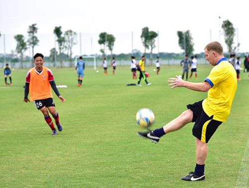Paul Scholes liên tục di chuyển trên sân hướng dẫn các cầu thủ U13 và chỉ tận tình các bài tập mới, khen ngợi các cầu thủ có khả năng thích ứng nhanh. Sự chỉ đạo tận tình của người thầy nổi tiếng trở thành nguồn cảm hứng khiến các cầu thủ trẻ tập luyện hăng say, cường độ cao.