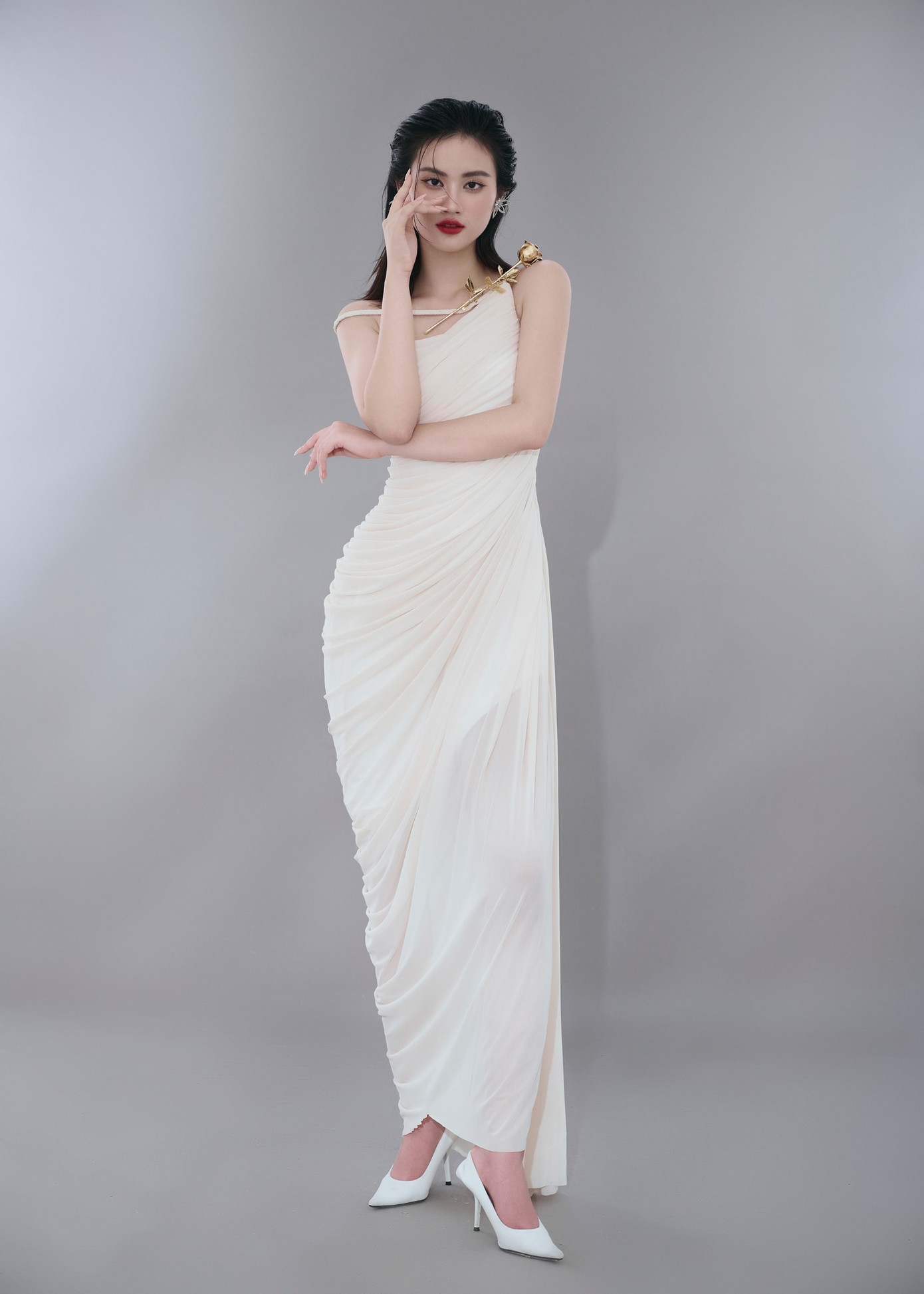 Xuất hiện tại các sự kiện, Ý Nhi chọn trang phục gam màu đơn sắc. Các thiết kế đầm tông màu trắng giúp Ý Nhi khoe được nhan sắc dịu dàng, trẻ trung. Người đẹp 22 tuổi tiết chế trang sức to bản, kết hợp cùng lối trang điểm đơn giản.