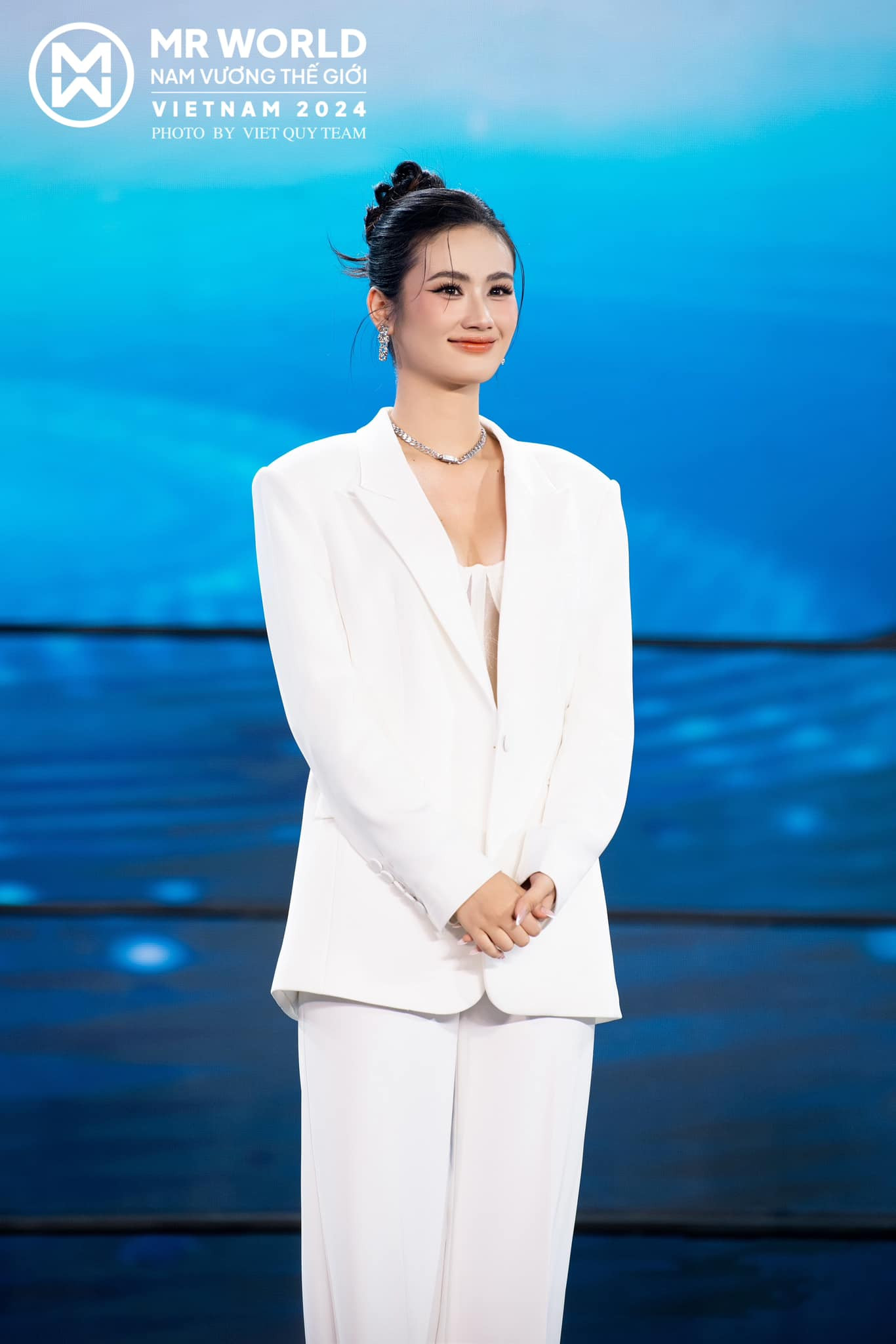 Hoa hậu Ý Nhi tham dự đêm Chung kết Mr World Vietnam (Nam vương Thế giới Việt Nam) 2024. Người đẹp ghi điểm trong trang phục mang hơi hướng menswear, kết hợp cùng kiểu tóc búi cao gọn gàng.