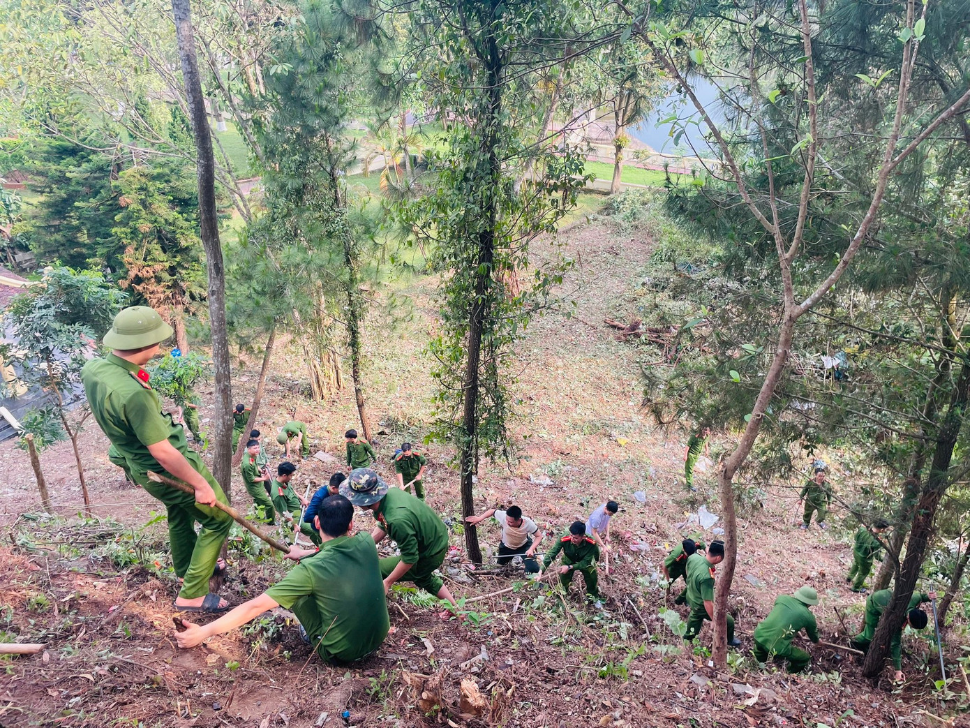 | Dù thời tiết nắng nóng, nhưng lực lượng công an huyện Đức Thọ với hơn 50 cán bộ đã đến góp sức di dời, cắt tỉa cây xanh, vệ sinh môi trường tại khu mộ Tổng Bí thư Trần Phú tại xã Tùng Ảnh. |