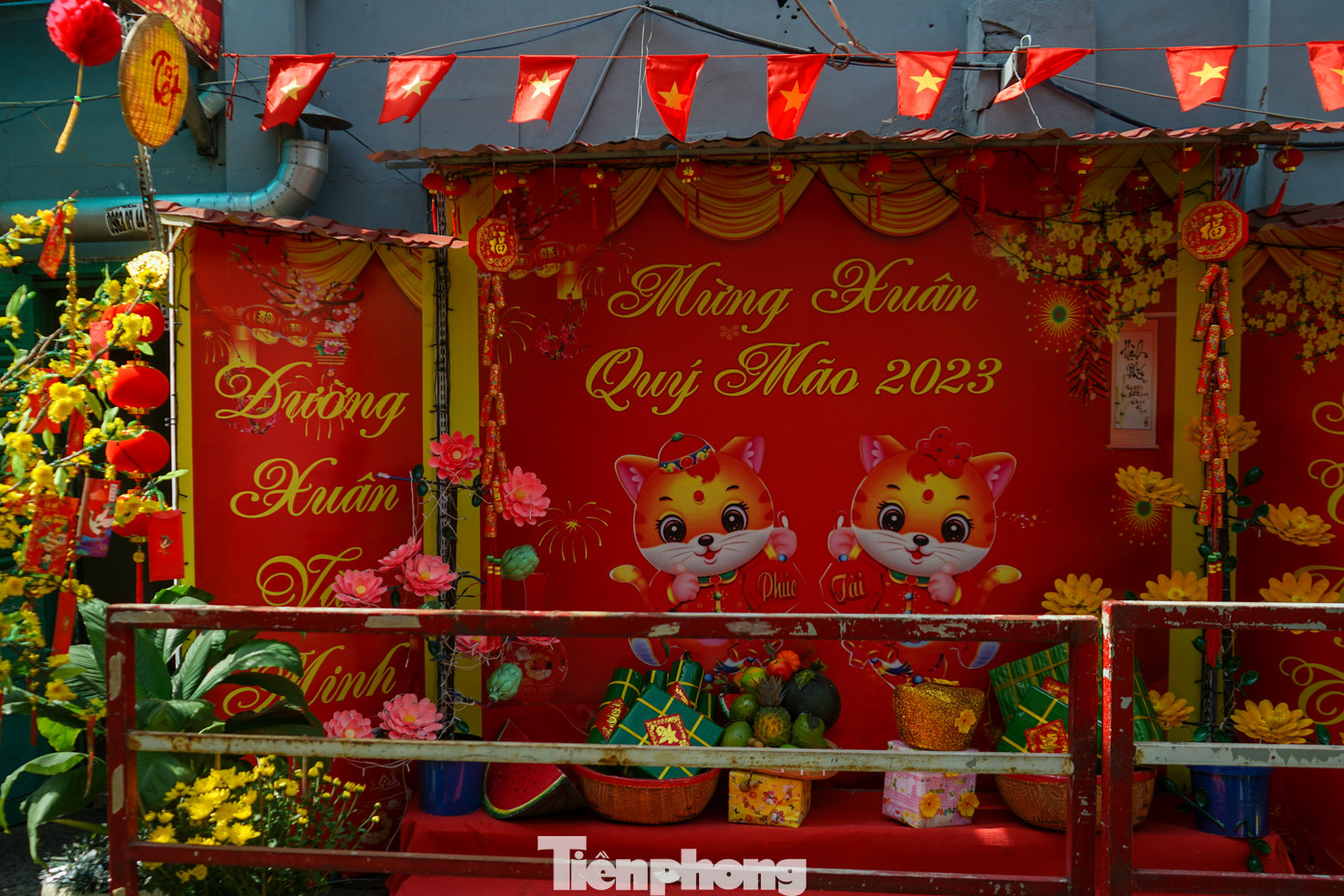 | Hẻm 100 Trần Hưng Đạo (phường Phạm Ngũ Lão, Quận 1) cũng được người dân và chính quyền trang trí với nhiều tiểu cảnh đậm chất Tết xưa. |