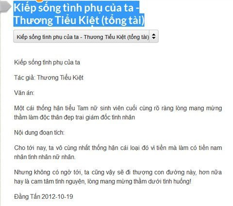 Trong một tác phẩm có tên "Kiếp sống tình phụ của ta" - tác giả Thương Tiểu Kiệt, sau khi dịch qua phần mềm, người dịch chia sẻ lên website một bản dịch như sau: