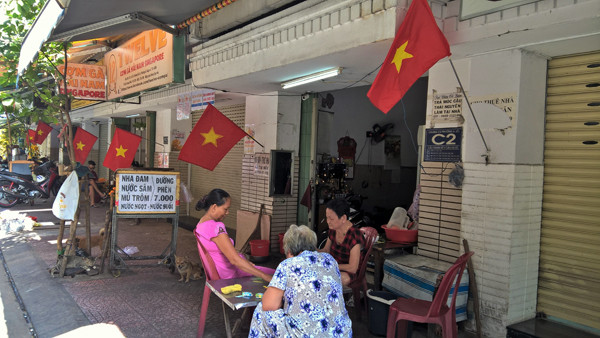 Khu tập thể ở quận 4 tràn ngập cờ và những người phụ nữ chơi ván bài đầu năm