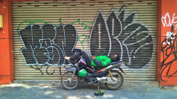 Ngày mồng Hai Tết, khách quá ít, người chạy xe ôm công nghệ tranh thủ làm một giấc ngủ trên lưng "con chiến mã" của mình.