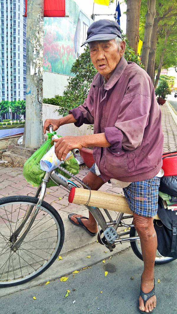 Ông cụ vô gia cư sinh năm 1939, quê ở Bến Tre, nói: "Đêm qua tôi ngủ ở gần cây xăng. Họ hàng bà con đã chết hết cả, còn lại mình tôi nên chẳng có ai thân thích mà về quê".