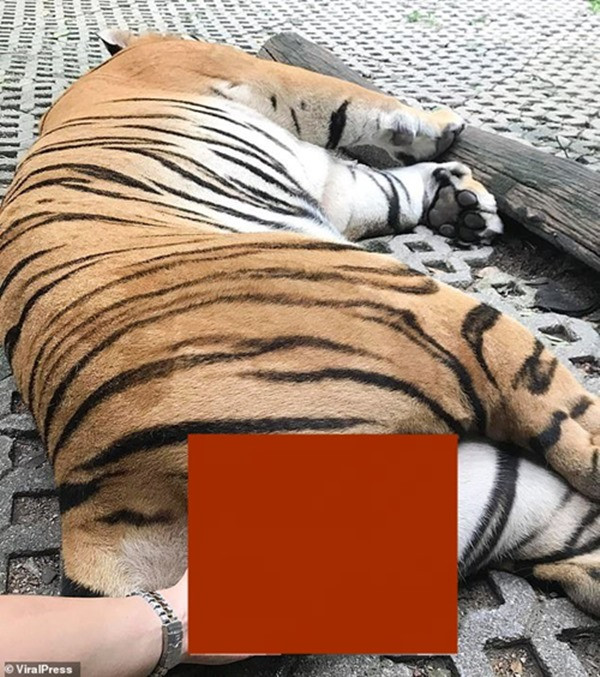 Nhưng để gây sốc, cô thò tay tóm lấy bộ phận sinh dục của con hổ (đực) và chụp ảnh trong tư thế đó.