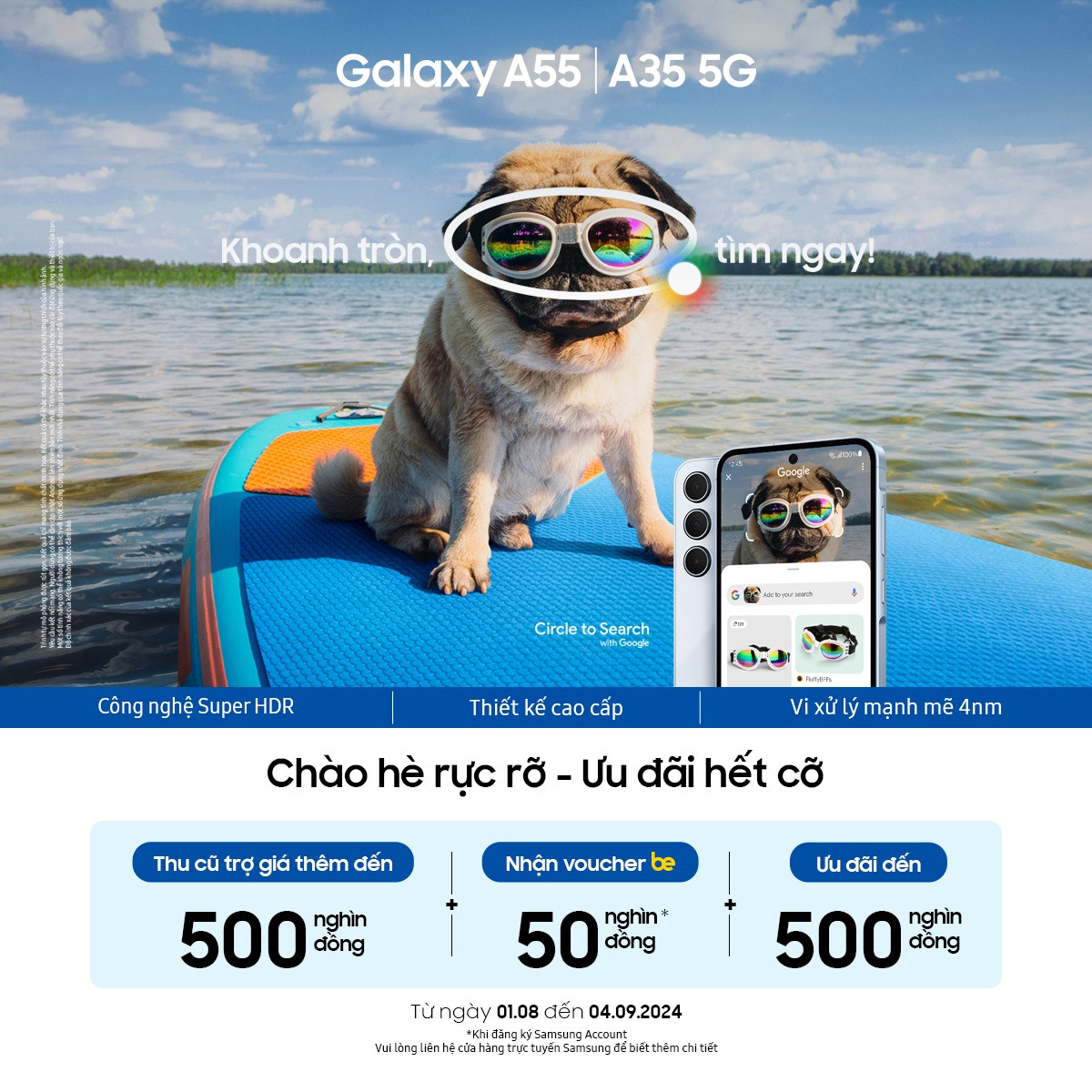 Đặc biệt, từ ngày 1/8/2024 cho đến hết ngày 4/9/2024, khi mua Galaxy A55 5G và Galaxy A35 5G, người dùng sẽ nhận ưu đãi 500.000 đồng cùng trả góp 0% và voucher be 50.000 đồng. Để biết thêm thông tin về Galaxy A35 5G và Galaxy A55 5G, vui lòng truy cập: https://www.samsung.com/vn/smartphones/galaxy-a/galaxy-a55-5g-awesome-iceblue-128gb-sm-a556elbaxxv/