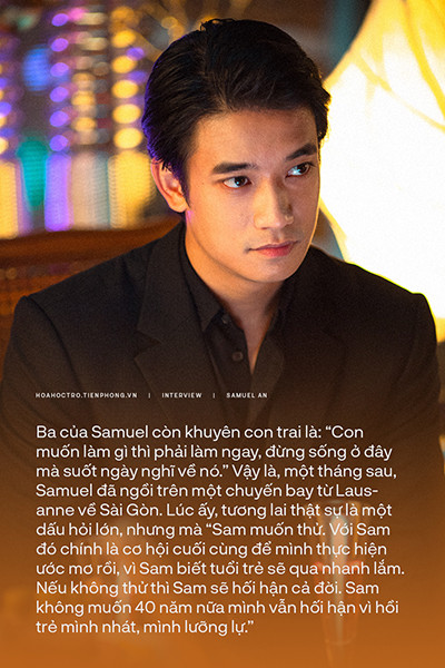 May mắn là ba mẹ của Samuel cũng thật “cool”! Sau khi biết ước mơ của con trai liền thúc giục anh chàng mua vé máy bay về Việt Nam. Ba anh của Samuel còn khuyên con trai là: “Con muốn làm gì thì phải làm ngay, đừng sống ở đây mà suốt ngày nghĩ về nó.” Vậy là, một tháng sau, Samuel đã ngồi trên một chuyến bay từ Lausanne về Sài Gòn. Lúc ấy, tương lai thật sự là một dấu hỏi lớn, nhưng mà “Sam muốn thử. Với Sam đó chính là cơ hội cuối cùng để mình thực hiện ước mơ rồi, vì Sam biết tuổi trẻ sẽ qua nhanh lắm. Nếu không thử thì Sam sẽ hối hận cả đời. Sam không muốn 40 năm nữa mình vẫn hối hận vì hồi trẻ mình nhát, mình lưỡng lự.”