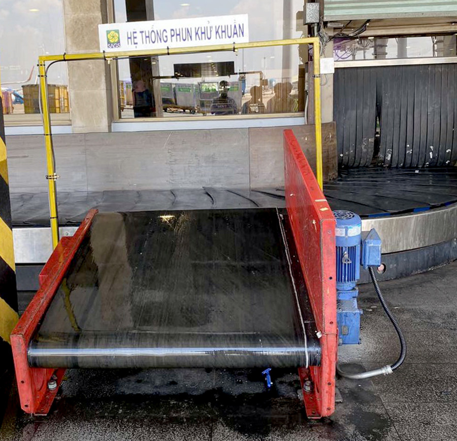 Theo đó, toàn bộ hành lý của hành khách đi và đến ở nhà ga quốc nội sân bay Tân Sơn Nhất khi di chuyển trên băng chuyền sẽ được phun khử khuẩn nhằm phòng tránh nguy cơ lây nhiễm.