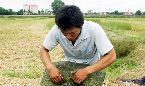 Trong phút chốc, châu chấu đã bám đầy lưới và nhóm "thợ săn" chỉ việc gom lưới lại rồi trút sản phẩm vào bao tải. Mỗi lần bắt theo kiểu này thường thu về được 30-40 kg.