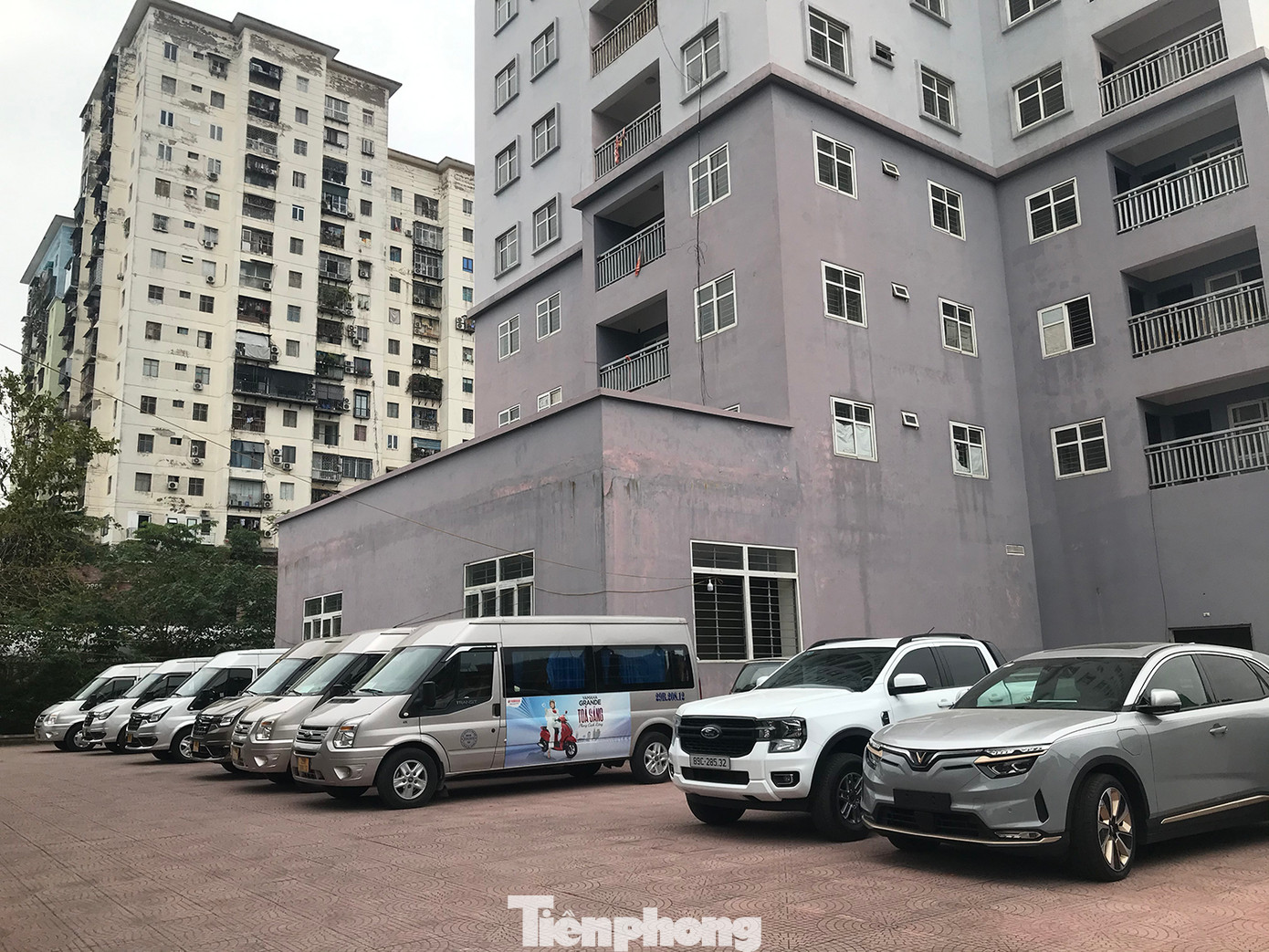 | Nhiều xe khách, xe dịch vụ "tập kết" ở khu vực sân chung cư tái định cư Đền Lừ. |