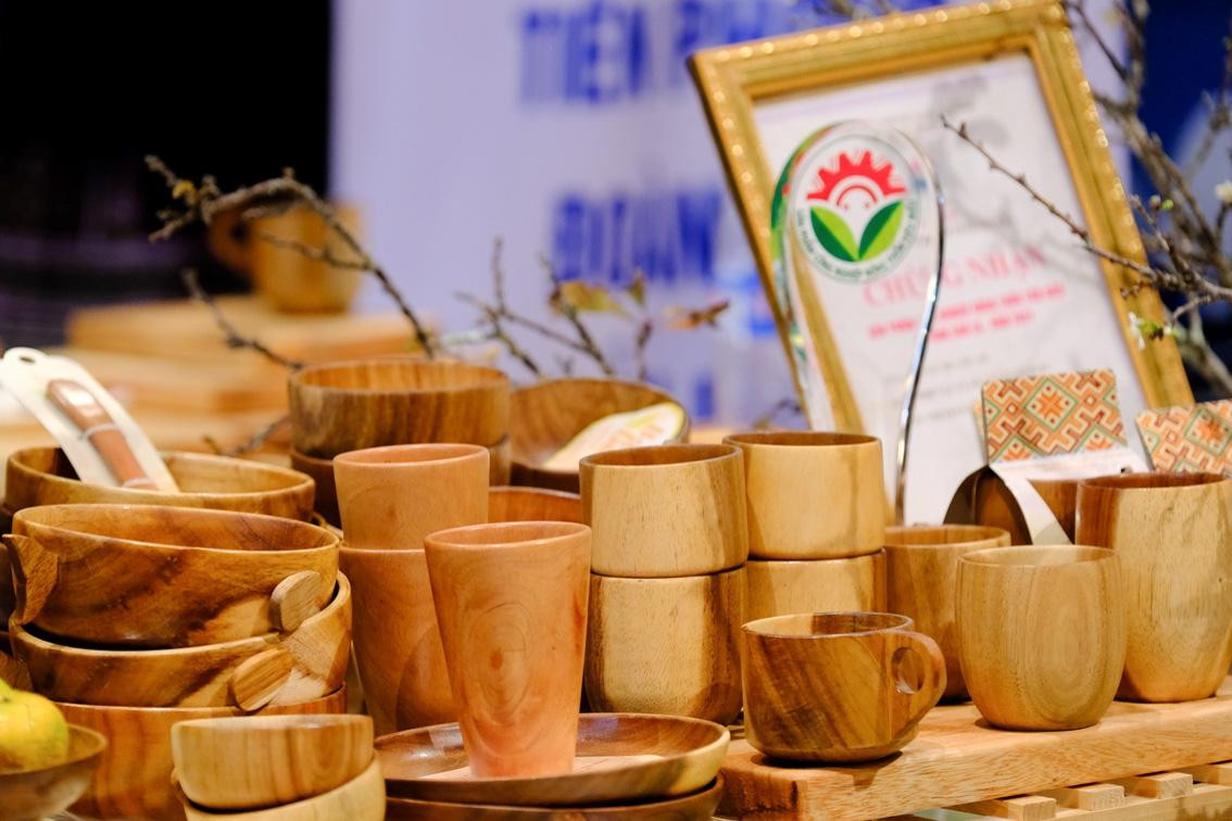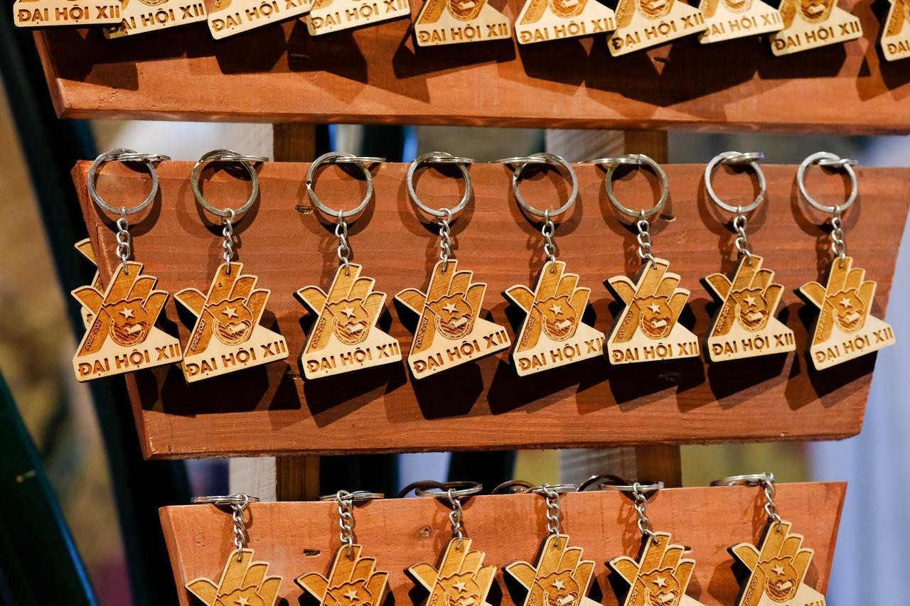 Tác giả của các sản phẩm thủ công này – anh Nguyễn Vũ Linh (sinh năm 1994, đến từ tỉnh An Giang) hào hứng giới thiệu: "Mỗi chiếc logo Đại hội được trưng bày ở đây đều được làm bằng gỗ địa phương của tỉnh An Giang. Kết hợp với công nghệ khắc laser, tôi đã phát triển ý tưởng làm logo Đại hội từ gỗ để giới thiệu một sản phẩm mới, lạ, ý nghĩa của gian hàng. Thông qua sản phẩm, tôi mong muốn truyền tải thông điệp tới các đại biểu trong việc bảo vệ môi trường, tận dụng nguyên liệu sẵn có của địa phương để sáng tạo thêm nhiều mặt hàng đặc trưng, ý nghĩa”. Ảnh: Châu Linh