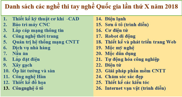 Kỳ thi tay nghề quốc gia lần thứ X được tổ chức từ ngày 13/5 đến 20/5 năm 2018 tại 6 Hội đồng thi với 520 thi sinh dự thi đến từ các bộ, ngành, hiệp hội và 48 tỉnh, thành phố trực thuộc trung ương ở 26 nghề.