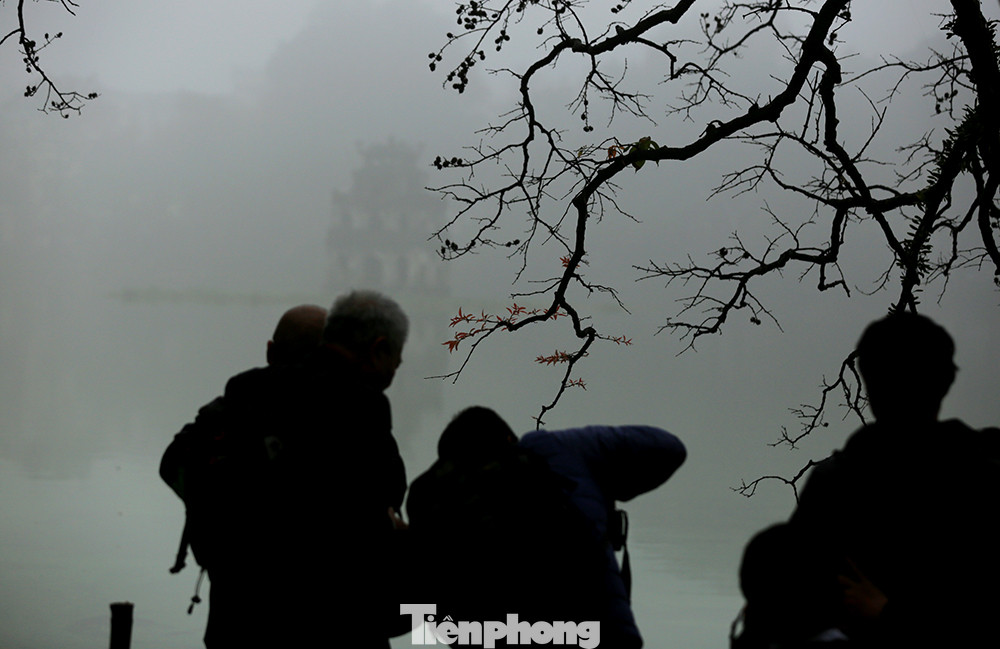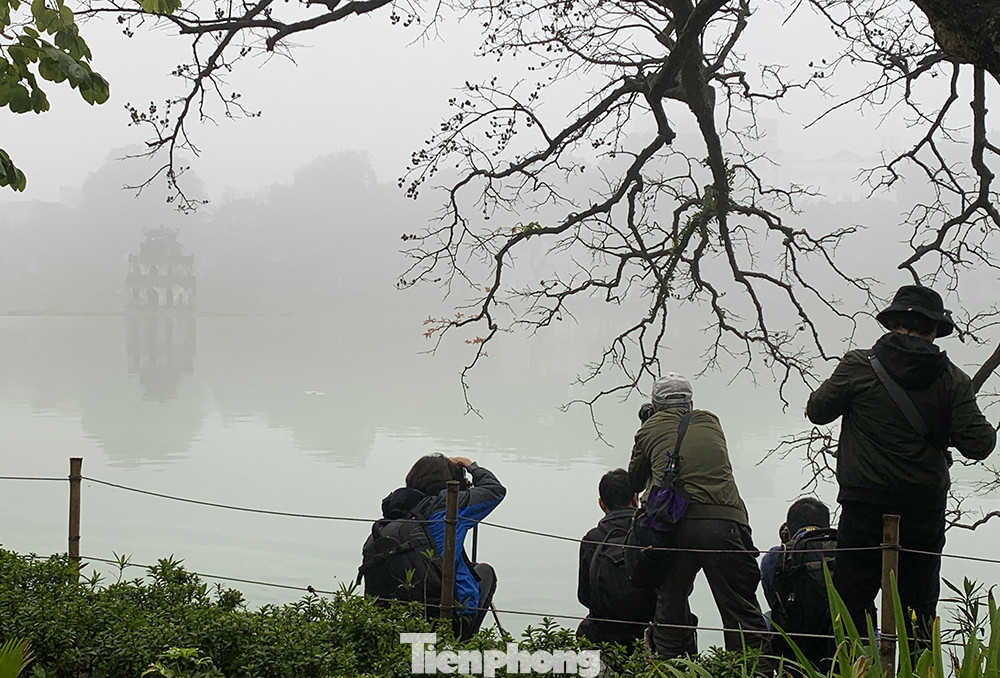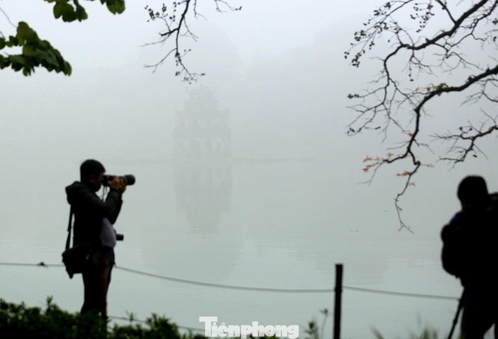 TPO - Những ngày này, nhiều người chụp ảnh đã đến Hồ Gươm từ sáng sớm để săn những bức ảnh tuyệt đẹp tại tháp rùa ngày mù sương mờ ảo như Sapa.