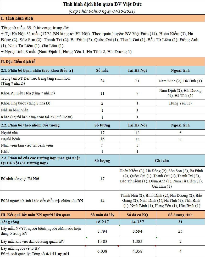 L.H.A, nam, sinh năm 1991, địa chỉ tại Mỹ Đình 2, Nam Từ Liêm; là người bệnh điều trị tại Trung tâm phẫu thuật đại trực tràng tầng sinh môn Bệnh viện Việt Đức, đã được xét nghiệm 1 lần âm tính. Ngày 3/10 được lấy mẫu xét nghiệm kết quả dương tính.