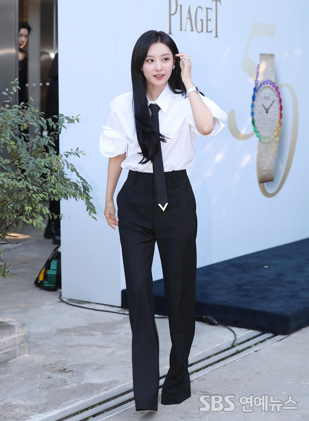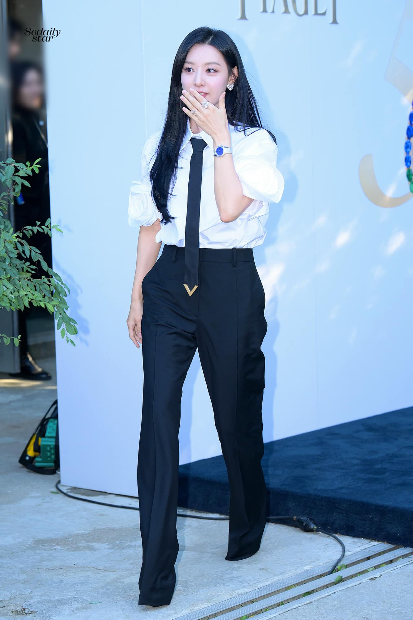Một lần khác, Kim Ji Won cũng mặc quần tây đen cùng với sơ mi trắng kèm cà vạt bản nhỏ. Điểm nhấn cho set đồ mang phong cách menswear này là phần tay áo được cách điệu thành bông hoa hồng rất đẹp mắt.
