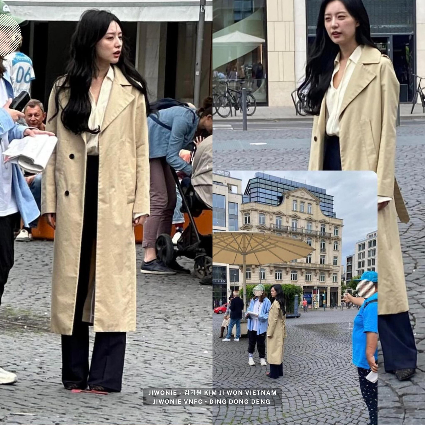 Khi nhìn tấm ảnh hậu trường khi Kim Ji Won quay Queen of Tears, netizen cũng phát hiện cô có thói quen mặc quần dài nhất có thể, gấu quần luôn dài chạm đất. Công thức này thường giúp kéo dài chân người mặc, nhưng gấu quần dài vừa phải, vẫn lộ một chút mũi giày thì sẽ cân đối hơn.