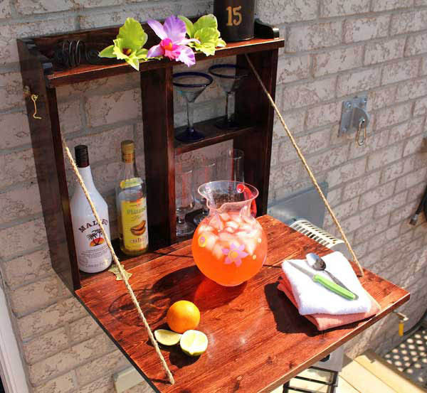 Không phải lo lắng về việc không gian sân sau của ngôi nhà hạn chế để tổ chức một quầy bar thư giãn ngoài trời, một góc nhỏ nhắn từ những thanh gỗ pallet tạo thành một kệ treo trên vách sẽ đủ chỗ để pha chế và trưng bày những thứ cần thiết.