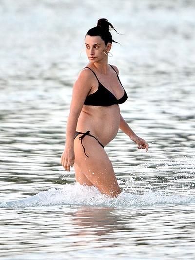 Penelope Cruz trong lần mang thai thứ hai vẫn giữ được thân hình thon gọn. Cô tạo dáng trên biển Barbados tháng 3/2013 khi đi chơi cùng Javier Bardem.