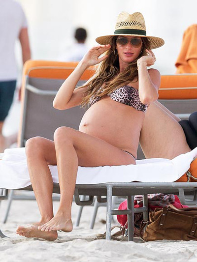 Siêu mẫu Gisele Bundchen mặc bikini họa tiết da báo, nằm phơi nắng trên biển Miami. Lúc này, cô đang mang thai con gái thứ hai - Vivian.