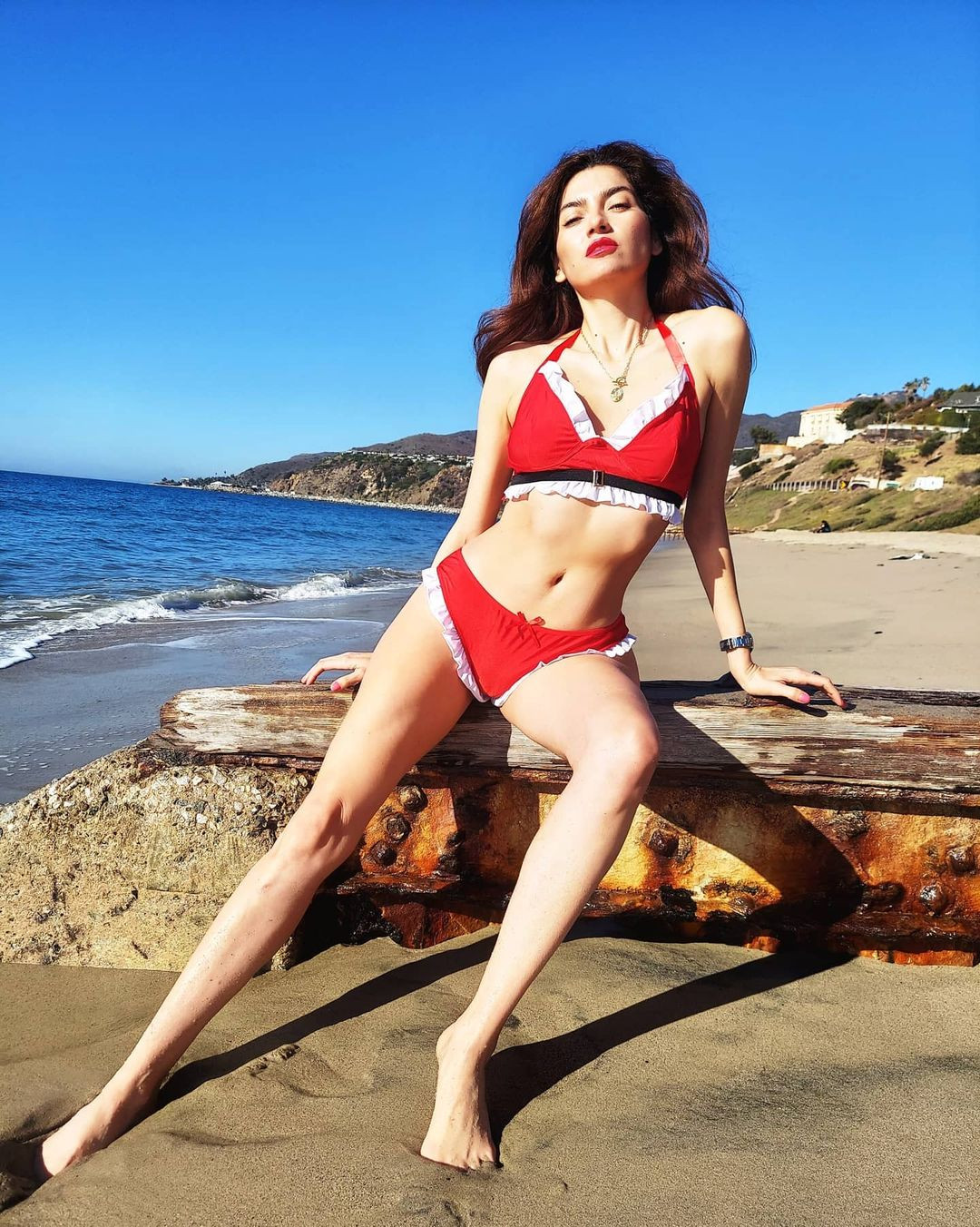 Nữ diễn viên U40 diện bikini đỏ bèo nhún khá trẻ trung so với tuổi.