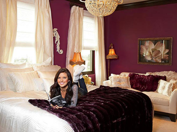 Người mẫu Audrina Patridge thường không muốn rời phòng ngủ êm ái và ấm cúng của cô. Căn phòng được thiết kế theo phong cách hoàng gia lộng lẫy với hai màu kem và tím chủ đạo.