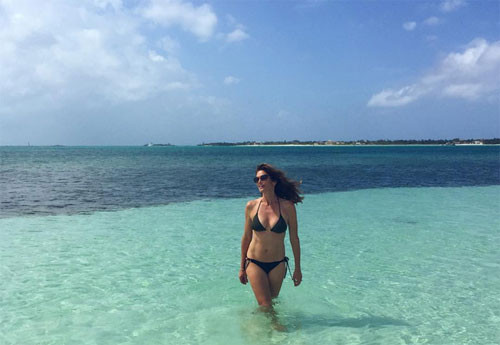 Siêu mẫu Cindy Crawford (50 tuổi) mặc đồ bơi hai mảnh tối màu, để lộ cơ bụng săn chắc.