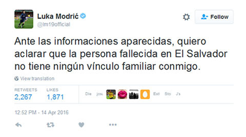 "Về những thông tin mới xuất hiện, tôi xác nhận rằng người phụ nữ bị sát hại ở El Salvador không có quan hệ máu mủ gì với mình", Modric chia sẻ trên trang cá nhân Twitter.