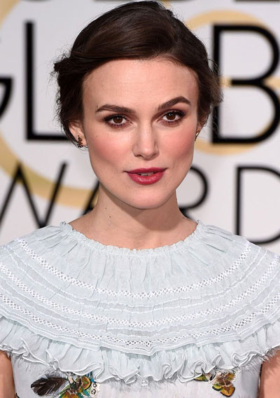 Keira Knightley chọn tông đỏ tía cho tổng thể khuôn mặt, thể hiện ở mắt, má và môi.