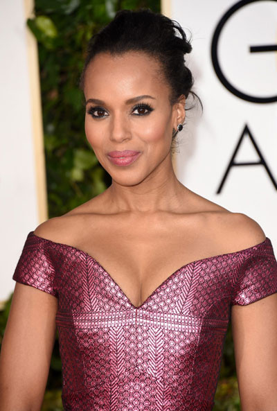 Kerry Washington tán nền màu nâu ăn nhập với làn da và tạo điểm nhấn ở đôi mắt to tròn. Nữ diễn hoàn thiện hình ảnh với môi màu berry.