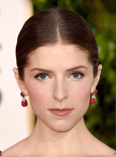 Má hồng, mắt bạc và son nude là phong cách được nhiều sao lựa chọn trên thảm đỏ Quả Cầu Vàng năm nay. Diễn viên Anna Kendrick cũng lựa chọn phong cách trên và kết hợp với đôi hoa tai đỏ.