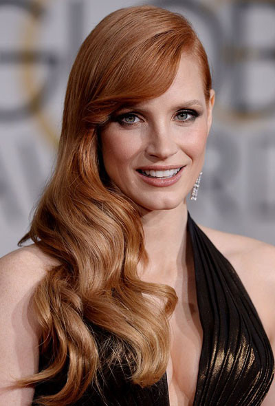 Jessica Chastain với kiểu tóc chải lệch thanh lịch, cổ điển. Nữ diễn viên trang điểm tông vàng đồng, với đôi mắt metallic và môi màu coral.
