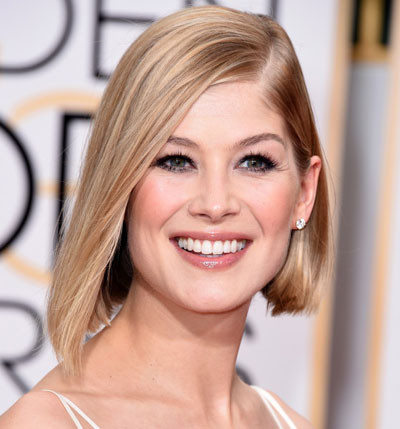 Diễn viên Rosamund Pike chọn tông cam đào và cặp môi bóng gợi cảm. Nữ diễn viên sở hữu gương mặt hình trái tim nên chọn cách trang điểm nhẹ nhàng để tôn lên tất cả đường nét xinh đẹp trên gương mặt. Kiểu tóc bob lệch khiến cô khá trẻ trung.