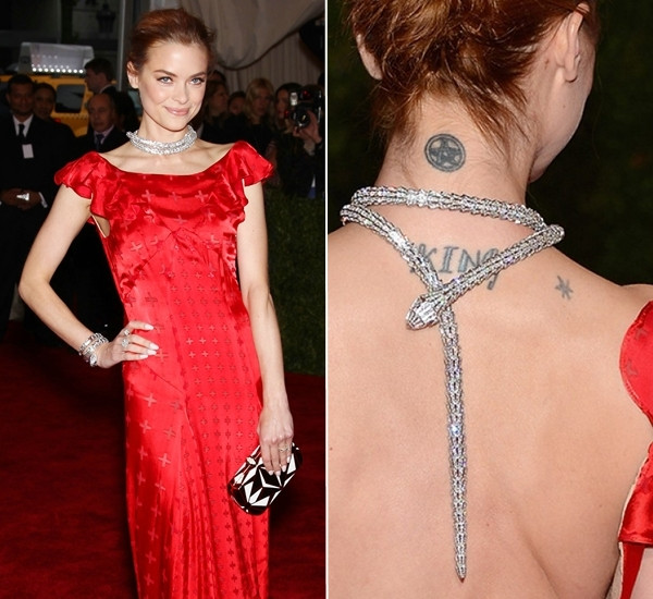 Người đẹp Mỹ Jamie King sang trọng và đẳng cấp hơn hẳn khi điểm phụ kiện Bulgari hình rắn sáng lấp lánh, dù diện váy Topshop giá rẻ.