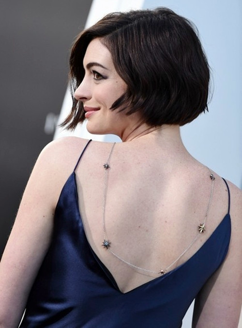 Kiều nữ Anne Hathaway đụng ý tưởng Jennifer Lawrence ở Oscar năm ngoái, nhưng thay bằng vòng dạng ngắn của Tiffany & Co. Cô phối cùng váy Prada cổ yếm khoe lưng mượt mà.