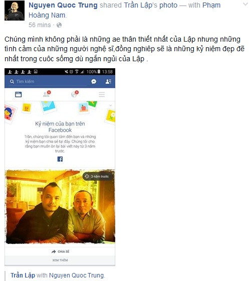 Nhạc sĩ Quốc Trung chia sẻ ảnh kỷ niệm với ca sĩ Trần Lập trên mạng xã hội