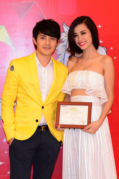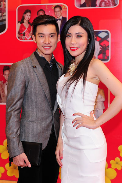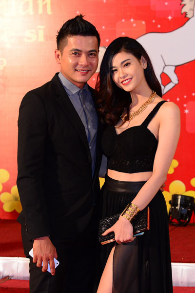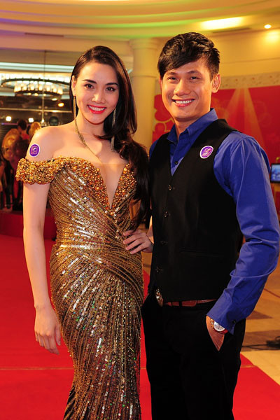 Á hậu Trang Nhung mặc bộ đầm trễ nải vai trần và xẻ ngực sâu bên cạnh diễn viên Võ Thành Tâm.