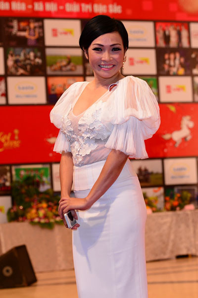 Ca sĩ Uyên Trang cũng chọn váy trắng đi tiệc.