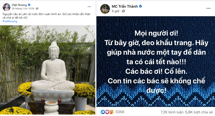 Không chỉ chủ động lên tiếng hủy sự kiện, các buổi tiệc tùng cuối năm..., nhiều người nổi tiếng như Trấn Thành, Việt Hương, Đàm Vĩnh Hưng đều lên tiếng kêu gọi mọi người giữ gìn sức khoẻ và tin tưởng vào chính phủ.