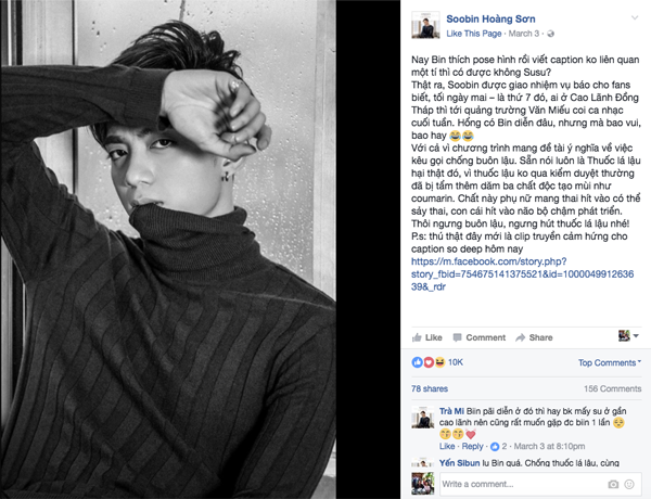 Và trên trang cá nhân của Soobin Hoàng Sơn, anh chàng đăng một tấm hình cực ngầu cùng caption đáng suy ngẫm: “Thuốc lá lậu hại thật đó, vì thuốc lậu ko qua kiểm duyệt thường đã bị tẩm thêm dăm ba chất độc tạo mùi như coumarin. Chất này phụ nữ mang thai hít vào có thể sảy thai, con cái hít vào não bộ chậm phát triển. Thôi ngưng buôn lậu, ngưng hút thuốc lá lậu nhé!”