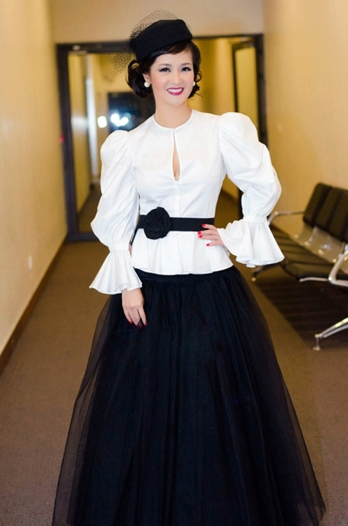 Diva Hồng Nhung cũng sử dụng chiếc mũ "hoàng gia" để bổ sung cho chiếc áo trắng và đầm dài bồng bềnh. Tuy nhiên, phong cách này khiến cô có phần già đi.