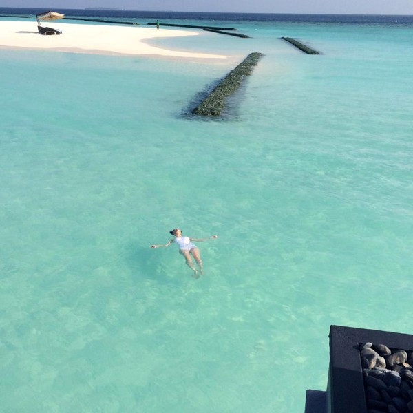 Nữ ca sĩ Trà My Idol thả người theo làn nước biển trong dịp đi du lịch cùng chồng sắp cưới vào đầu năm 2014. Một đặc điểm ấn tượng nữa ở Maldives là làn nước trong xanh ngắt, có thể nhìn xuyên thấu cả những rạn san hô đầy màu sắc.