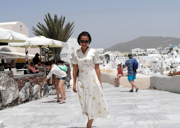 Hồng Ánh chia sẻ, tới Santorini cô mới được chiêm ngưỡng nước biển xanh trong vắt, phong cách thiết kế nội thất đậm chất vintage ở nơi đây cũng khiến cô thích thú. Gần Santorini có một miệng núi lửa và các dòng nước nóng thu hút du khách.
