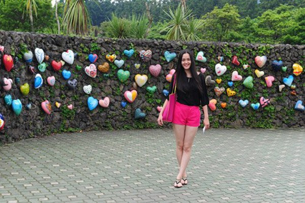 Á hậu Hoàng Anh cũng ghi dấu ấn của mình tại đảo Jeju. Hoàng Anh chụp ảnh tại Love Land - công viên giáo dục giới tính, nơi không ít khách du lịch “đỏ mặt” vì các biểu tượng tình yêu nơi đây.