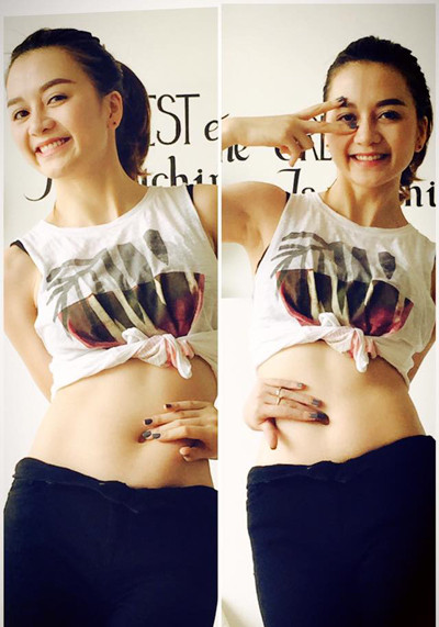 Các sao Việt cũng nhanh chóng tận dụng trào lưu "tay chạm rốn" để khoe vóc dáng thon gọn của mình. Hoa hậu Kỳ Duyên vừa đăng ảnh mình uốn tay đặt lên rốn và thách thức những người đẹp khác như Huyền My, Thùy Dung, Mai Phương Thúy thực hiện.